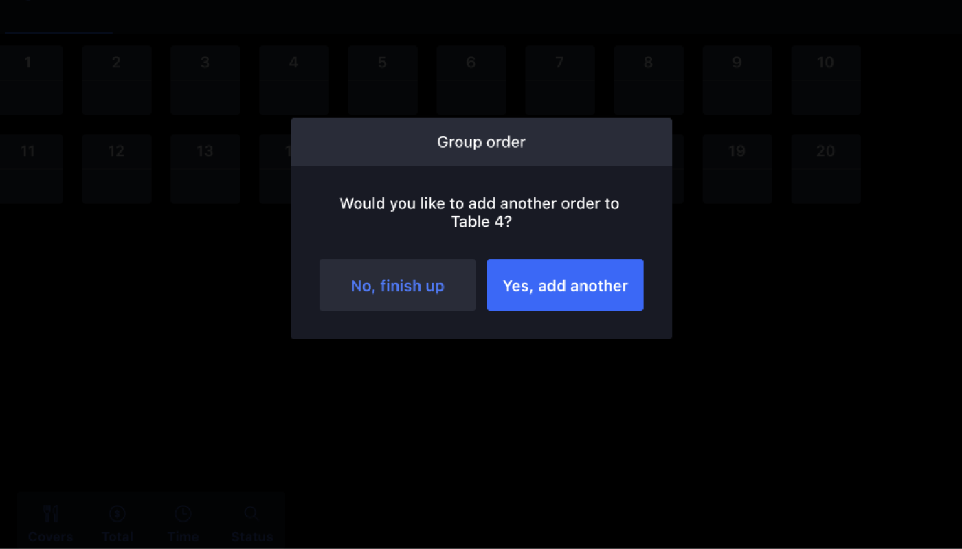 Nachdem Sie die erste Bestellung der Gruppe aufgenommen haben, beginnen die Timer für maximale Zeit zwischen Bestellungen und maximale Zeit seit der ersten Bestellung. Die Kasse fordert Sie dann auf, dem Tisch eine weitere Bestellung hinzuzufügen. Falls Sie das automatische Abmelden von POS-Benutzern auf sofort gestellt haben, wird die Aufforderung, dem Tisch eine weitere Bestellung hinzuzufügen, nicht angezeigt.