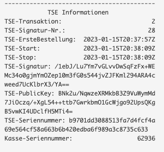 Für in Deutschland ansässige Händler zeigen die an Ihrem Restaurant-POS gedruckten Quittungen zwei Arten von Zeitstempeln an. Der erste Zeitstempel befindet sich in der Kopfzeile der Quittung und zeigt an, wann die Quittung gemäß der auf Ihrer Kasse konfigurierten Zeitzone ausgestellt wurde. Der zweite Zeitstempel ist erforderlich und befindet sich im Unterschriftbereich. Dieser Zeitstempel gibt die Start- und Endzeit des Bestellvorgangs an und wird in UTC dargestellt (gekennzeichnet durch „Z“ am Ende), wodurch sich eine Zeitdifferenz zwischen den beiden Zeitstempeln ergibt. Der Zeitstempel im Unterschriftbereich kann nicht bearbeitet werden.