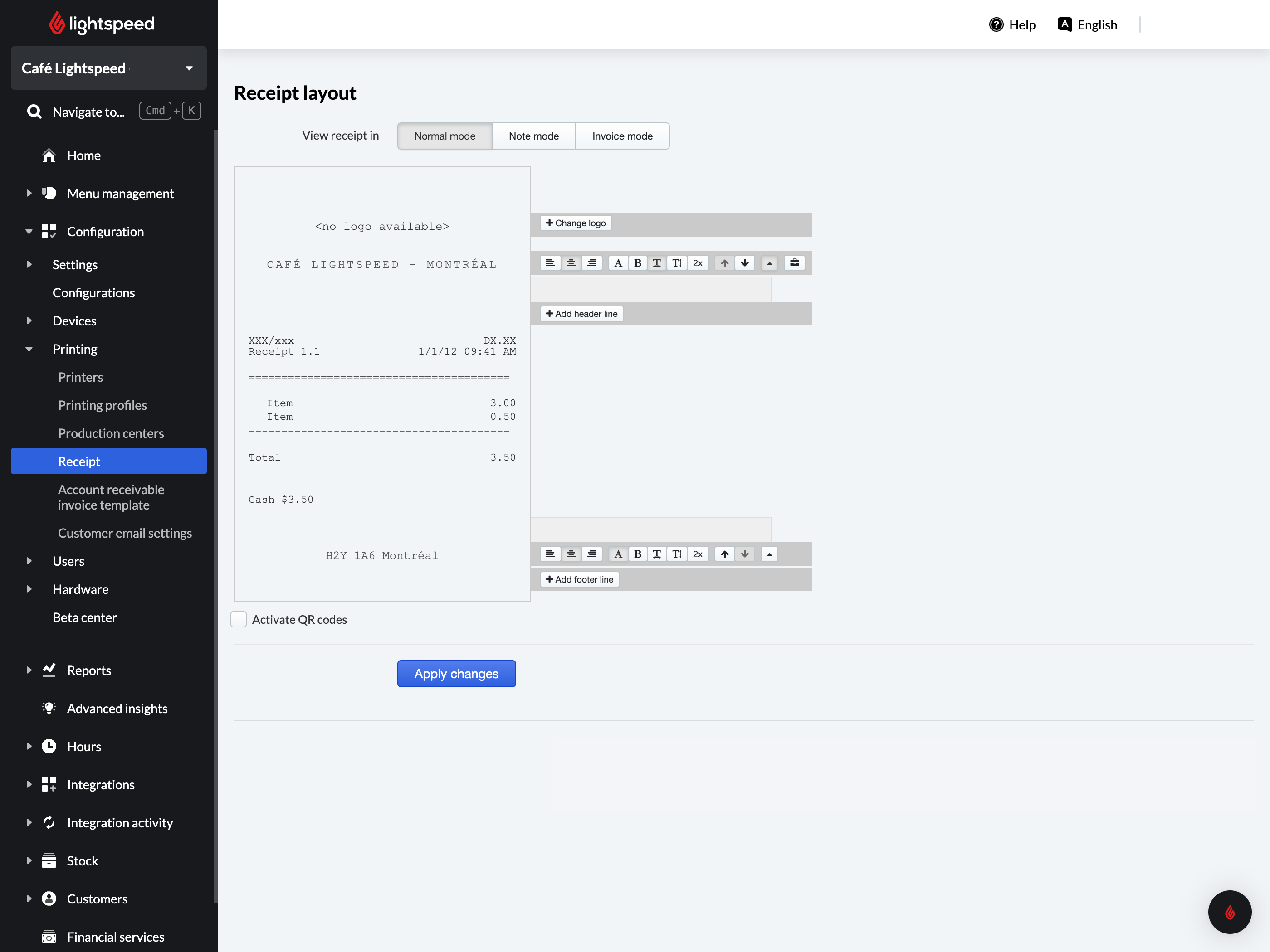 Quittungen sind gedruckte oder digitale Dokumente, die als Nachweis einer Transaktion dienen. Mit Lightspeed Restaurant können Sie Ihre Quittungen und Vorlagen nach Bedarf im Backoffice anpassen. Durch Bearbeiten der Quittungsvorlage können Sie steuern, welche Informationen auf Ihre Quittungen gedruckt werden, und deren Erscheinungsbild an Ihre Geschäftsanforderungen anpassen.