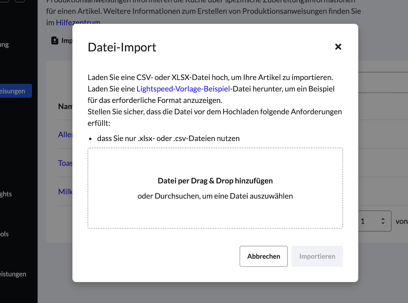Sparen Sie Zeit, indem Sie Produktionsanweisungen direkt in das Backoffice importieren. Sie können nur CSV oder XLSX verwenden.