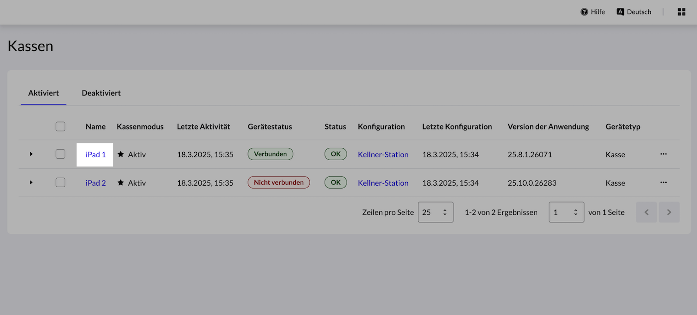 Kassenmodus: Wenn Aktiv ist die Kasse aktuell mit Ihrem Konto verbunden. Wenn Passiv wurde die Kasse für Ihr Konto deaktiviert und ist aktuell inaktiv. Um inaktive Kassen anzuzeigen, klicken Sie auf die Registerkarte Deaktiviert oberhalb der Tabelle auf der Seite.