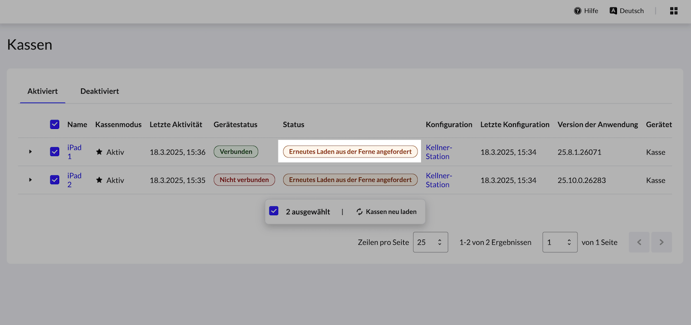 Der Status des Geräts/der Geräte ändert sich in Bitte neu laden, bis die Kasse neu geladen wurde. Wenn der Vorgang abgeschlossen ist, ändert sich der Status in OK.