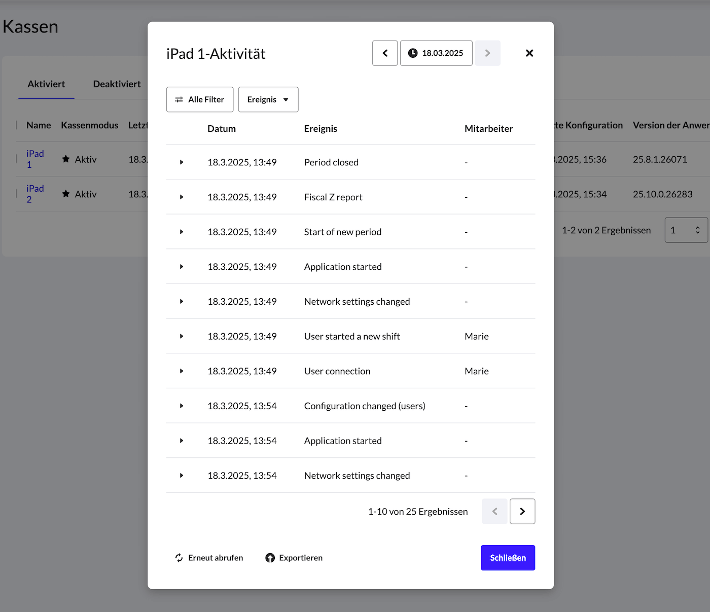 Möchten Sie die grundlegenden Aktionen überprüfen, die an einer Kasse durchgeführt werden (z. B. das Eröffnen eines Verkaufszeitraums durch einen POS-Benutzer oder das Einstempeln), können Sie das Gerät prüfen. Dadurch wird ein Ereignisprotokoll für die ausgewählte Kasse angezeigt.