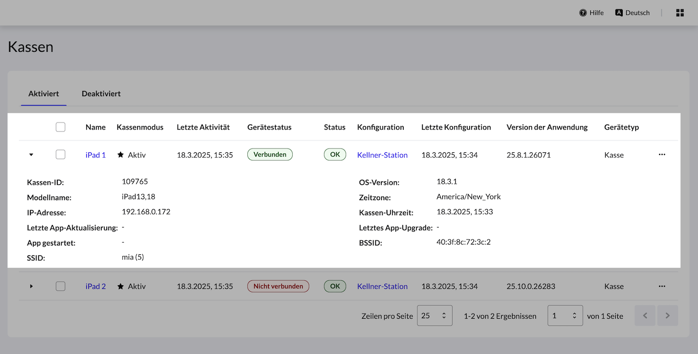 Die Kassen-Seite bietet eine umfassende Übersicht über grundlegende und erweiterte Kassendetails. Grundlegende Kassendetails sind in der Kassentabelle gut sichtbar. Um erweiterte Details anzuzeigen, klicken Sie auf den Pfeil neben dem Gerätenamen.