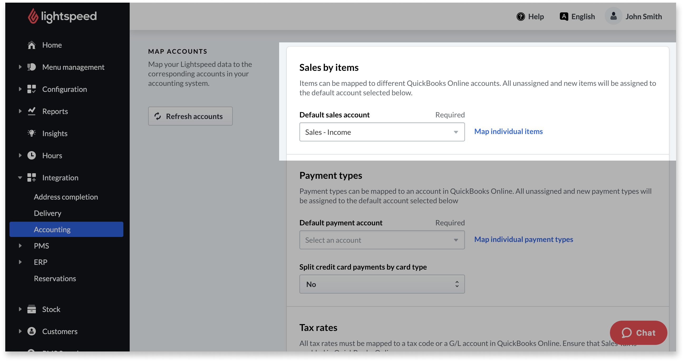 Schließen Sie die Einrichtung von Lightspeed Accounting ab, indem Sie Ihre Lightspeed-Verkaufsdaten den allgemeinen Sachkonten in Ihrer Buchhaltungssoftware zuordnen, in denen diese Informationen synchronisiert werden sollen. Konfigurieren Sie zusätzliche Einstellungen, um einen Standardkundennamen oder eine Rechnungsnummer hinzuzufügen oder die Standortverfolgung zu aktivieren.