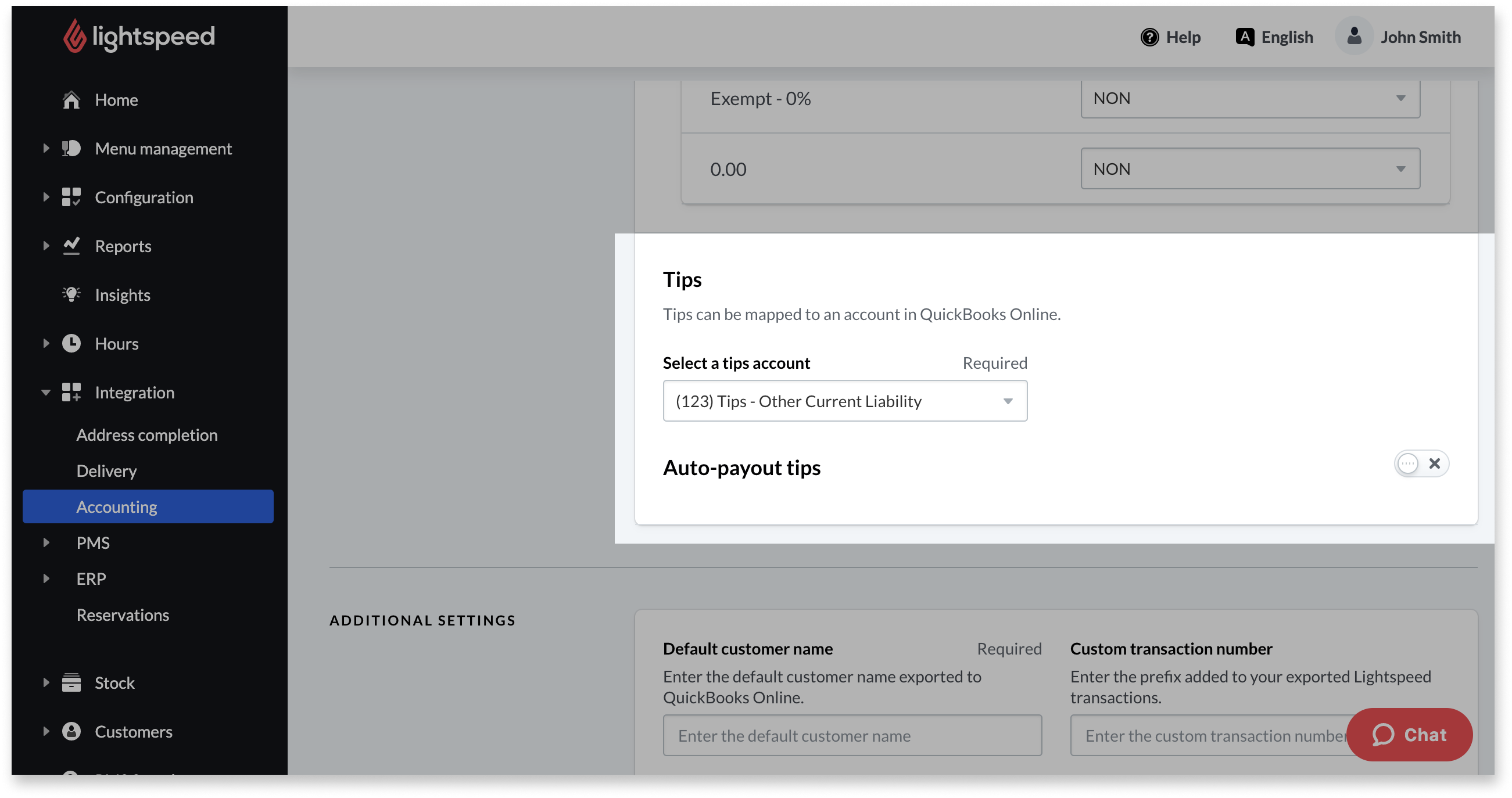 - (Optional) Aktivieren Sie Auto-payout tips (automatische Auszahlung von Trinkgeldern), wenn Sie dem Personal jeden Abend Trinkgelder per Kreditkarte in bar auszahlen und Lightspeed Accounting diese als Auszahlungen erfassen soll.