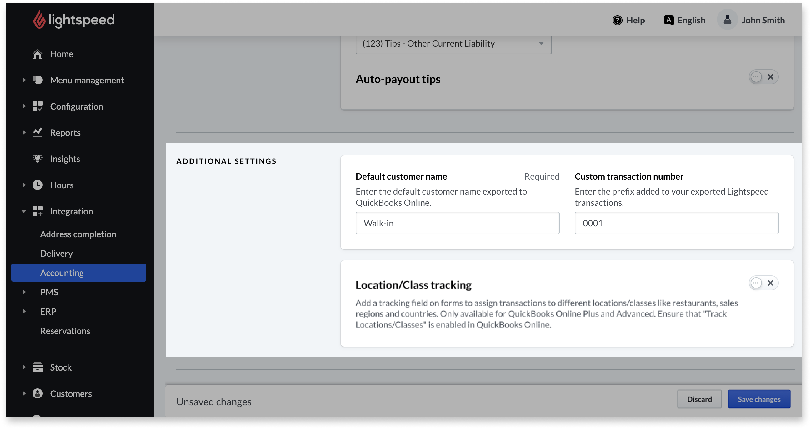 - Location/Class tracking (Standort-/Klassenverfolgung, optional) – Fügt ein Feld für Nachverfolgung hinzu, um Transaktionen verschiedenen Standorten oder Klassen zuzuordnen, z. B. Restaurants, Verkaufsregionen und Ländern. Vergewissern Sie sich, dass die Einstellung für die Standort-/Klassenverfolgung in Ihrer Buchhaltungssoftware aktiviert ist, bevor Sie diese Einstellung in Lightspeed Accounting aktivieren. Diese Einstellung ist nur für QuickBooks und Xero verfügbar.