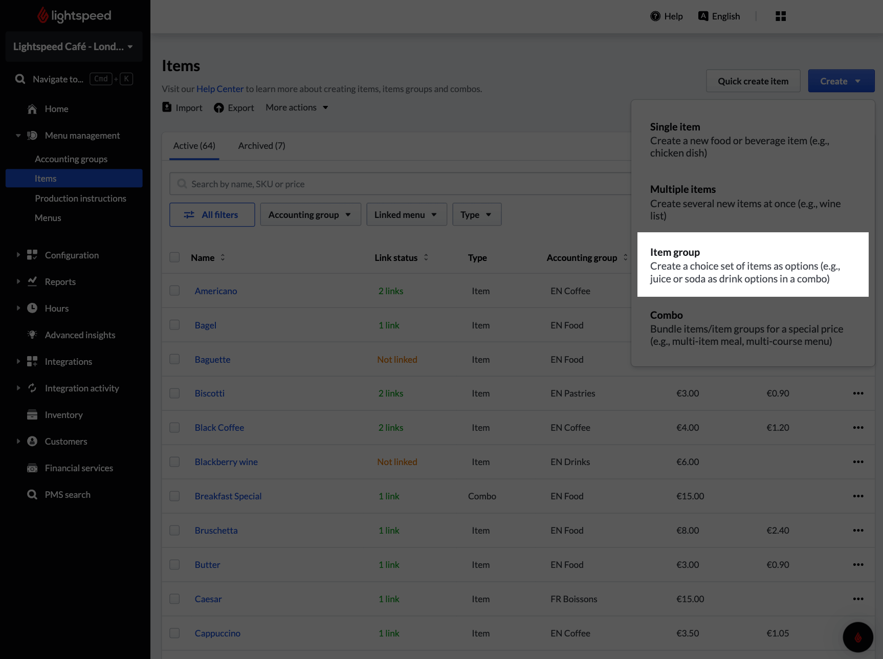 Artikelgruppen sind Sets mit ähnlichen Artikeln, aus denen ein Kunde eine oder mehrere Optionen auswählen kann. Artikelgruppen erleichtern das Erstellen von Gruppen für Combo-Menüs. Beispielsweise könnte eine Artikelgruppe mit der Bezeichnung „Beilage“ aus Pommes Frites, Zwiebelringen und Salat bestehen. Ein Combo-Menü könnte die Gruppe „Beilage“ beinhalten, wobei der Kunde dann einen Artikel aus diesen Optionen auswählt.