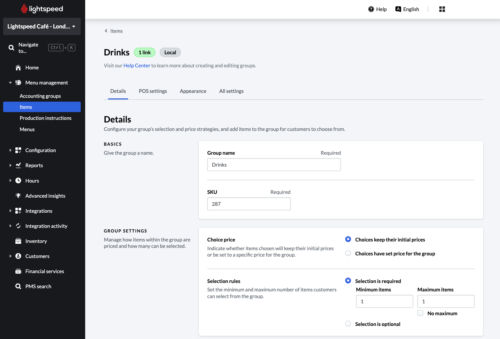 Auswahlregeln: Legen Sie die minimale und maximale Anzahl der Artikel fest, die Kunden aus der Gruppe auswählen können sowie dass Auswahlregeln optional sind. Aktivieren Sie das Kontrollkästchen Kein Maximum, um zu vermeiden, dass eine maximale Anzahl erforderlich ist.