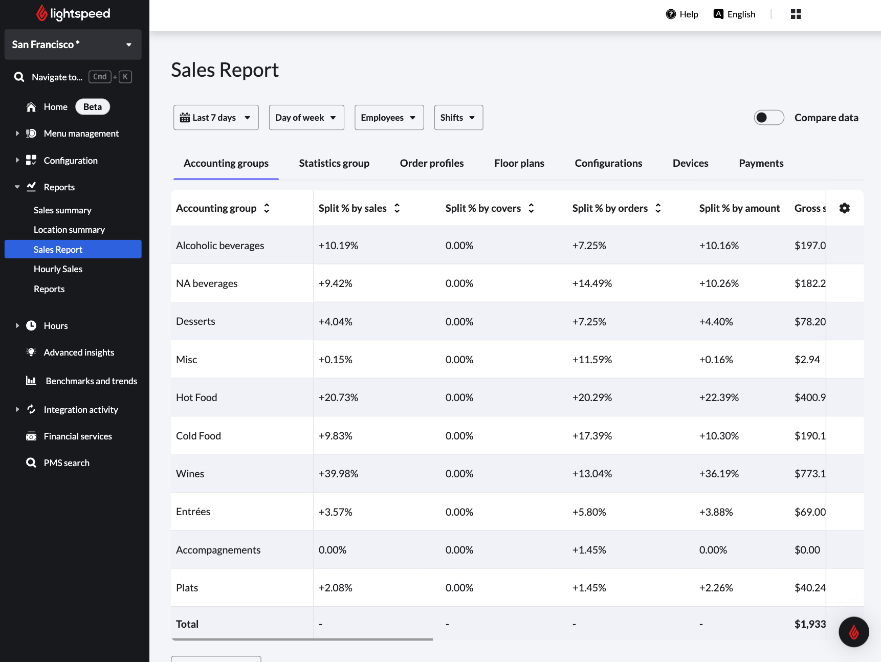 Vergleichen Sie Zeiträume, um zu sehen, wann Ihre Umsätze am höchsten oder am niedrigsten sind. Sie können auch bestimmte Wochentage, Mitarbeiter oder Mitarbeitergruppen sowie Schichten vergleichen.