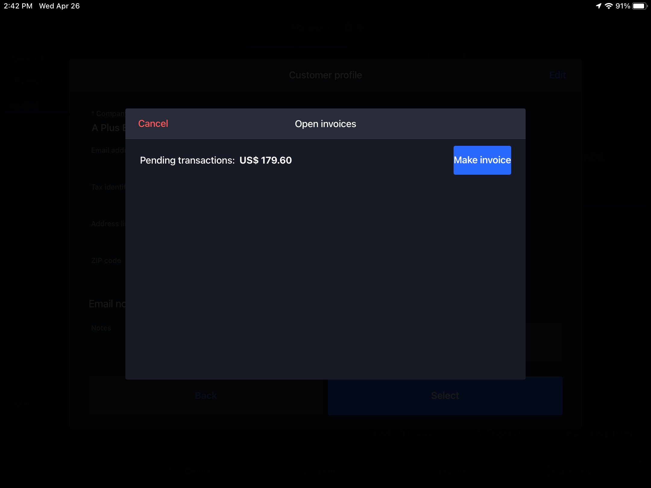 Erstellen Sie nach der Bearbeitung eines Rechnungsauftrags eine Rechnung für den Auftragseingang auf der Seite Offene Konten (Forderungen) im Back Office oder in der POS-App. Wenn Sie die Schritte in diesem oder dem vorherigen Abschnitt nicht ausführen, können Sie die Rechnung nicht begleichen, wenn der Kunde sie bezahlt.