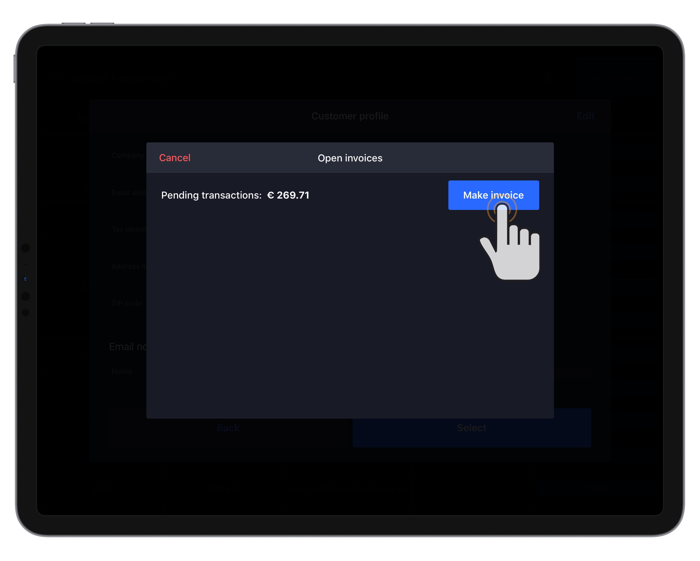 Bearbeiten Sie eine Bestellung in der Lightspeed Restaurant POS-App mit der Zahlungsart Rechnung, um eine Quittung zu erstellen. Sobald die Transaktion abgeschlossen ist, wird sie die Seite Offene Konten (Forderungen) im Backoffice hinzugefügt, sodass Sie eine Rechnung für Ihren Kunden erstellen können.