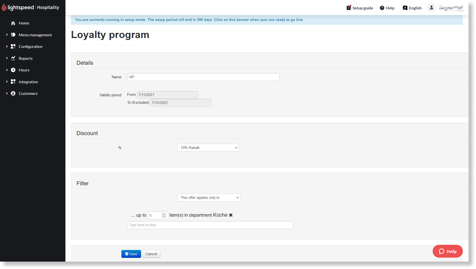 | Filterregel (Dieses Angebot…) | Mit dieser Option können Sie die Rabatte der VIP-Karte auf Artikel bestimmter Kategorien beschränken (Dieses Angebot gilt nur für…) oder Artikel bestimmter Kategorien ausschließen (Dieses Angebot gilt nicht für…). |