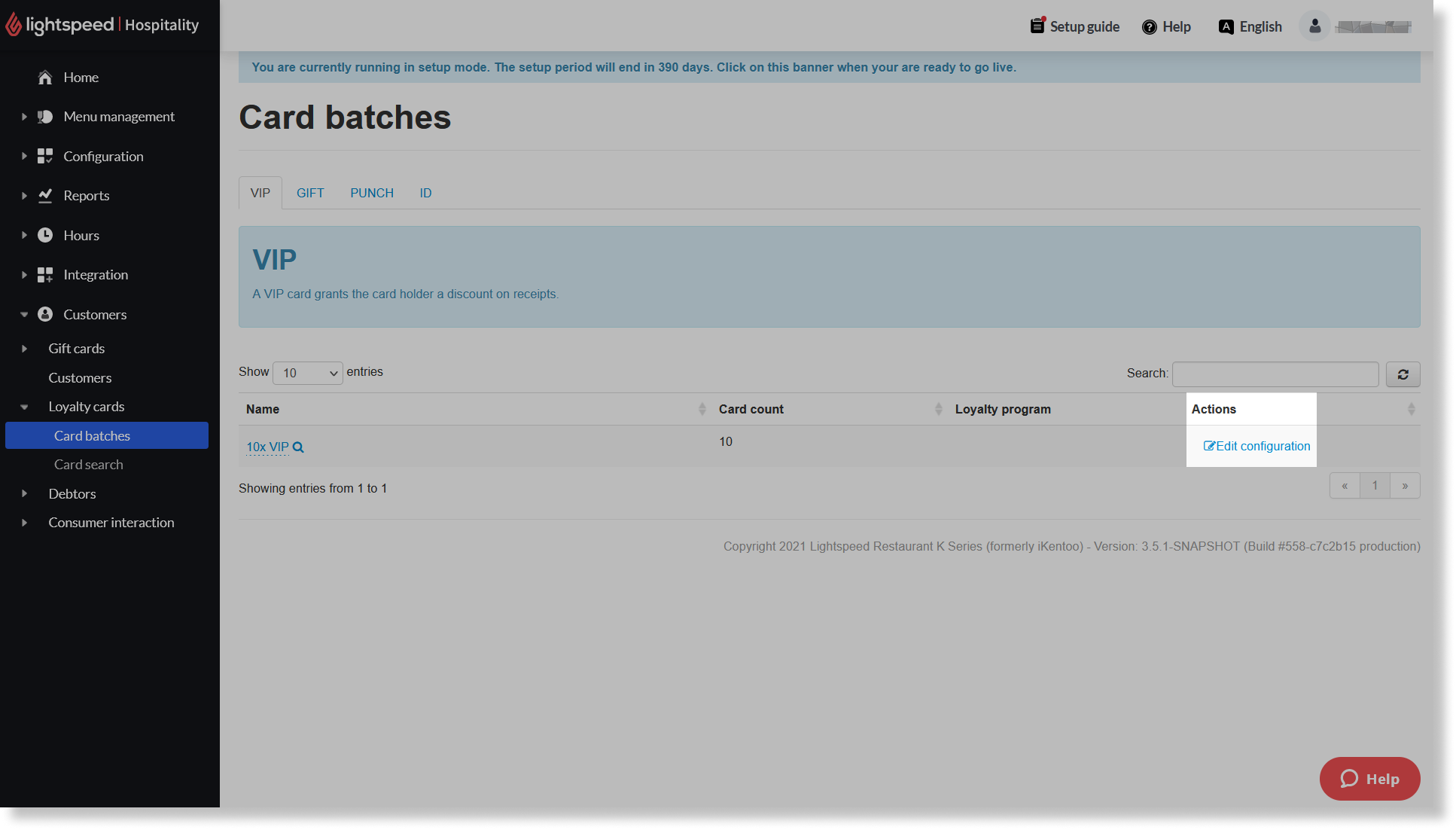 Sie können die Einstellungen für eine VIP-Kartenserie ändern, beispielsweise um einzuschränken, welche Artikel rabattiert werden können, indem Sie auf Konfiguration bearbeiten klicken. Beachten Sie dabei jedoch, dass Sie die Einstellungen für die gesamte Serie und nicht für eine einzelne Karte ändern.