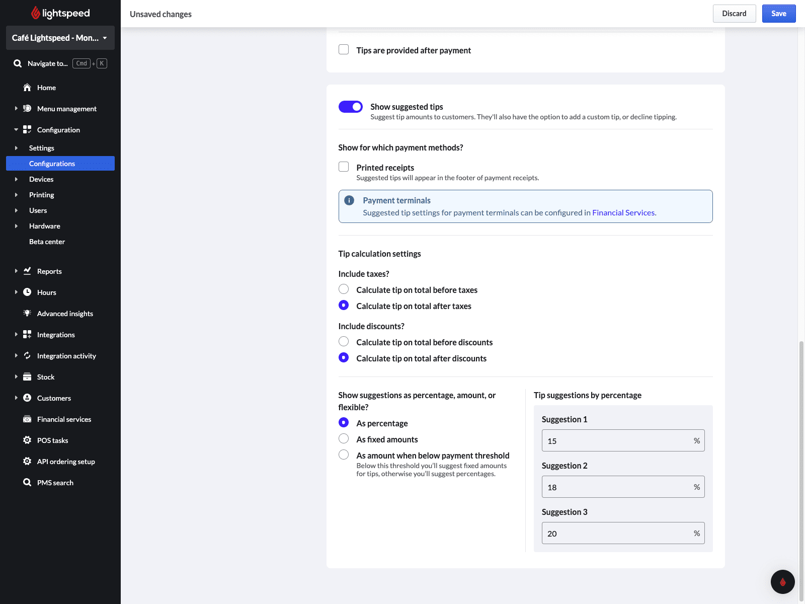Sie können Ihre kundenseitigen Trinkgeldoptionen so anpassen, dass sie als Prozentsätze, feste Beträge oder basierend auf einem festgelegten Schwellenwert angezeigt werden.