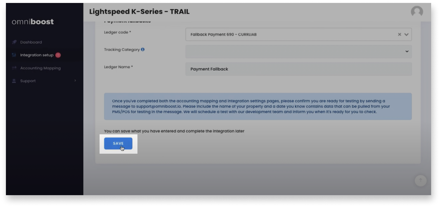 - Klicken Sie auf Speichern, um Ihre Einstellungen zu speichern und die Einrichtung Ihrer Omniboost-Buchhaltungsintegration abzuschließen.