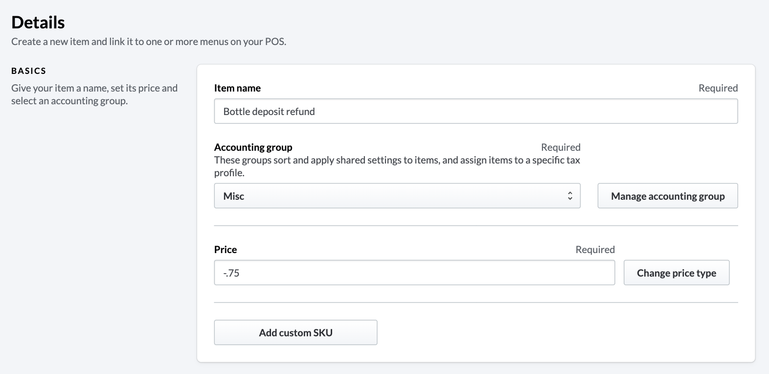 - Price: Amount of the deposit as a negative price. For example, if the deposit on a bottle of beer is $0.75, the negative price would be -$0.75.