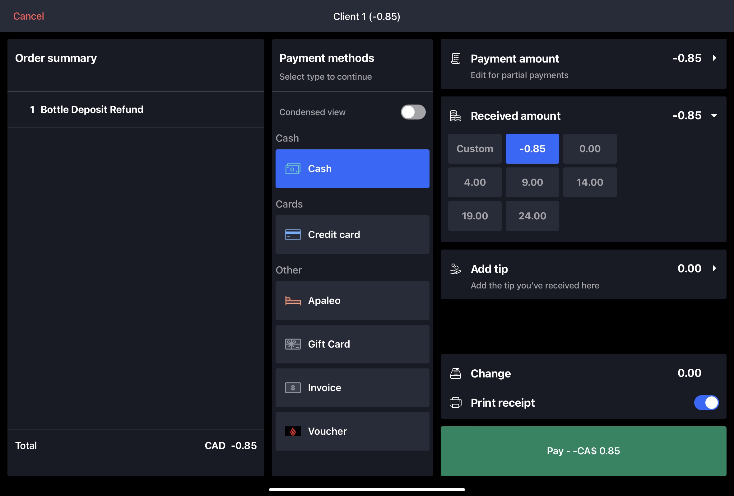 In Lightspeed Restaurant, you can handle bottle deposits in two ways: using a negatively priced item as the deposit refund or using a partial refund. Use a negatively priced item to save time; instead of searching for a specific order, you can simply refund via a button on the POS. If time isn't a factor, use partial refunds to refund the deposit directly.