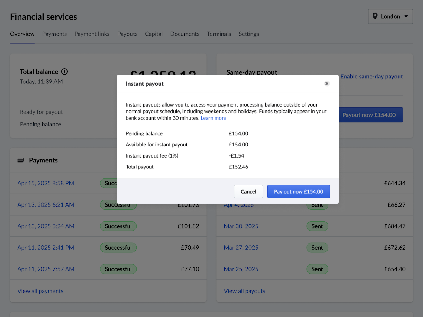 - Follow the prompts in the instant payout window to confirm the amount for payout, minus fees.