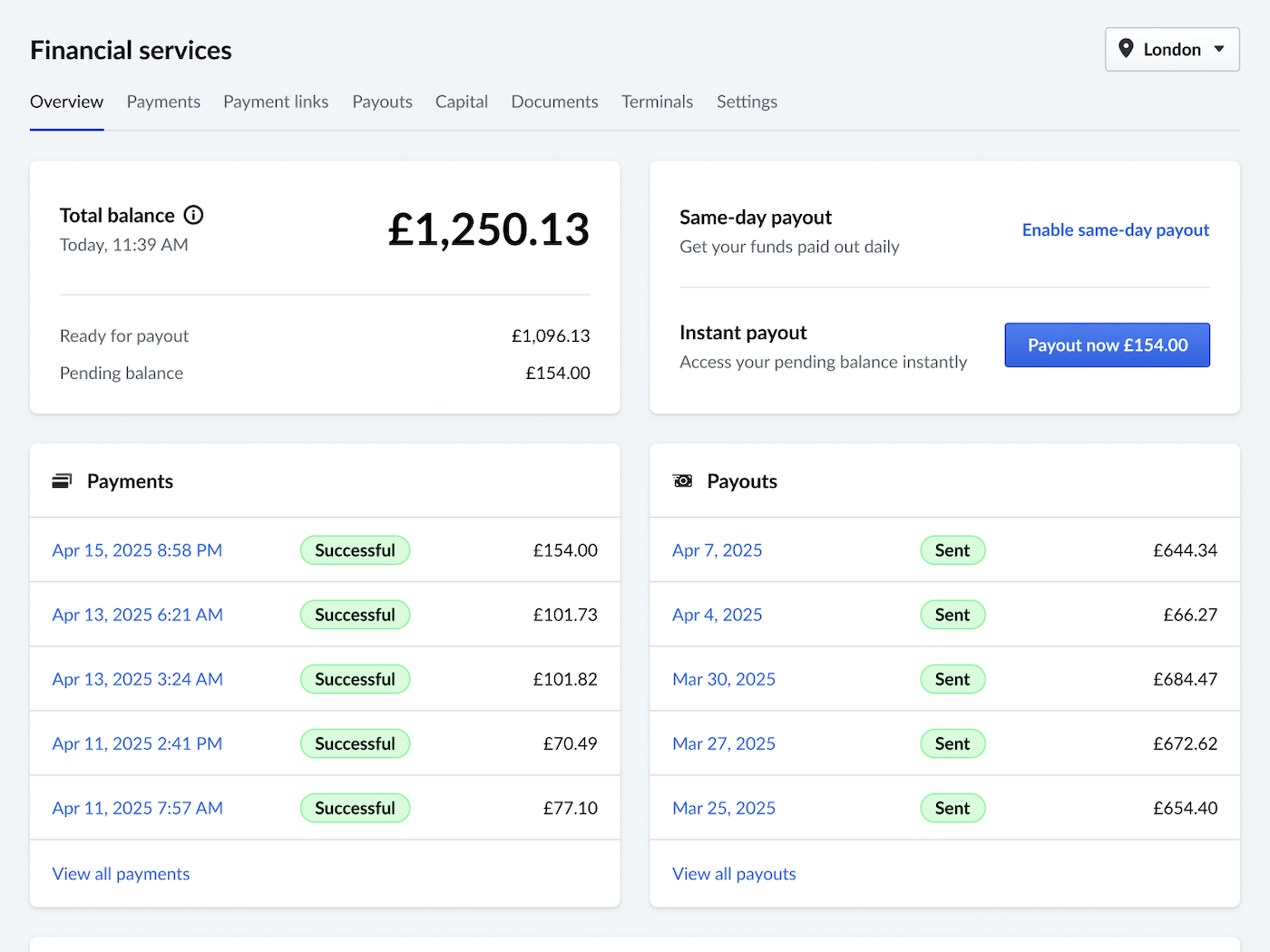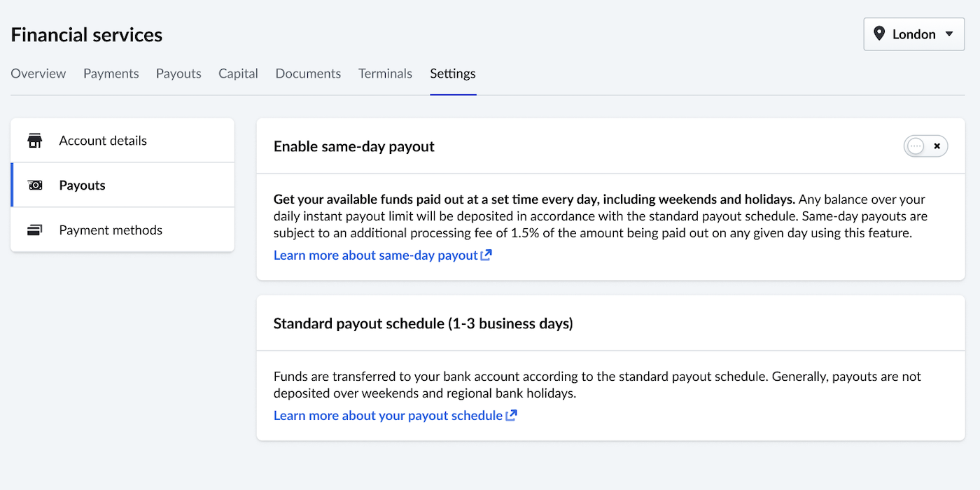 - Same-day: An instant payout configured to pay out automatically at a set time each day. Funds are paid out within 30 minutes.