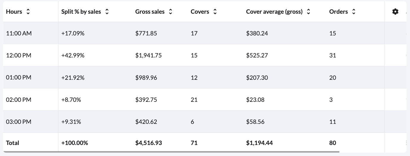 Sales with covers (gross): The total amount per hour of sales with covers before discounts and taxes.