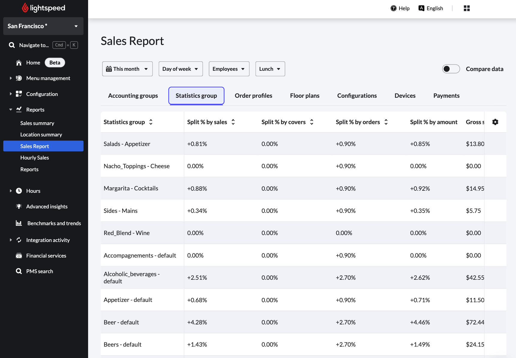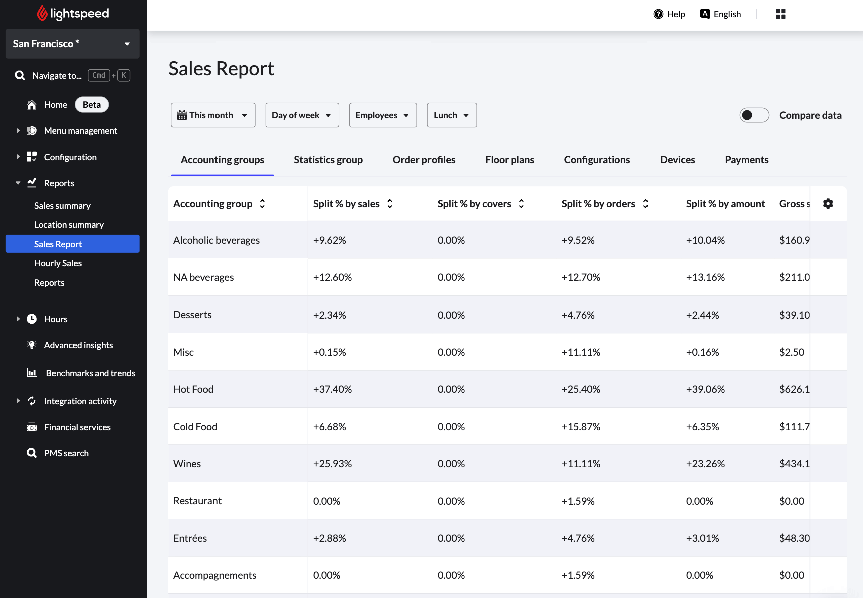 Accounting groups: Accounting groups organize similar items together for tax, printing, and reporting purposes. This tab lists all of your accounting groups and displays data broken down into specific areas like Gross sales and split percentages.