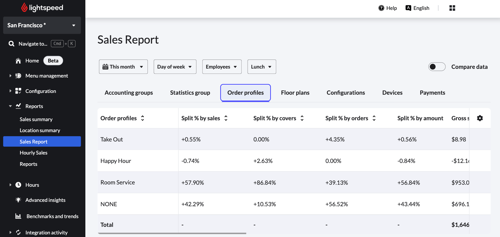 Order profiles: Order profiles allow you to apply preset settings to orders at the POS, either manually or on an automatic schedule. This tab lists all of your order profiles and displays data broken down into specific areas like Gross sales and split percentages.