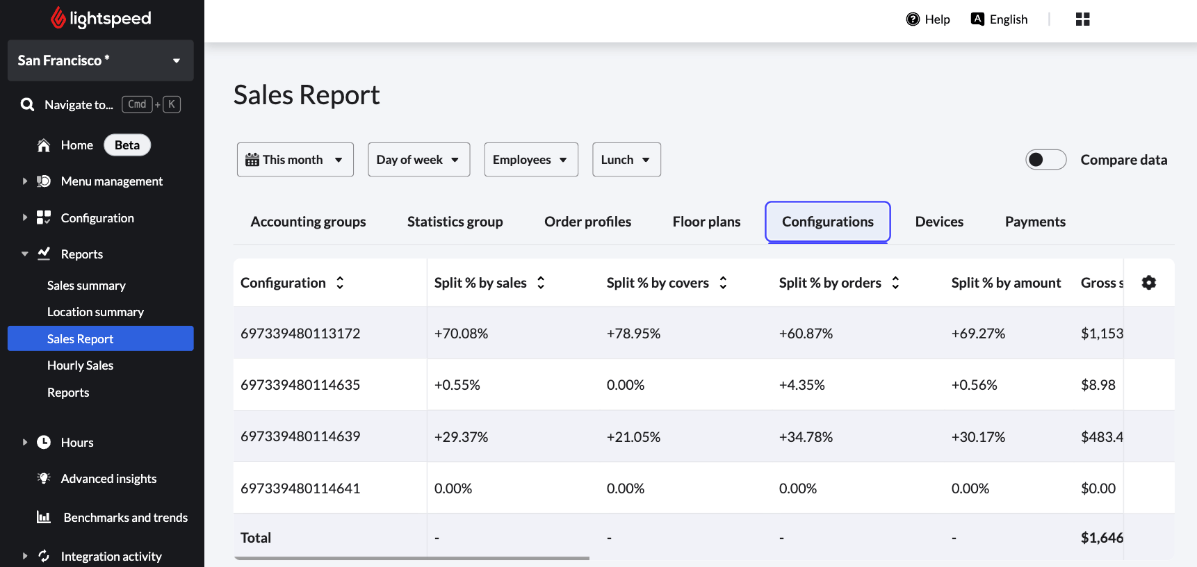 POS configurations: POS configurations are a collection of settings controlled from the Back Office and applied to your POS devices. This tab lists all of your configurations and displays data broken down into specific areas like Gross sales and split percentages.
