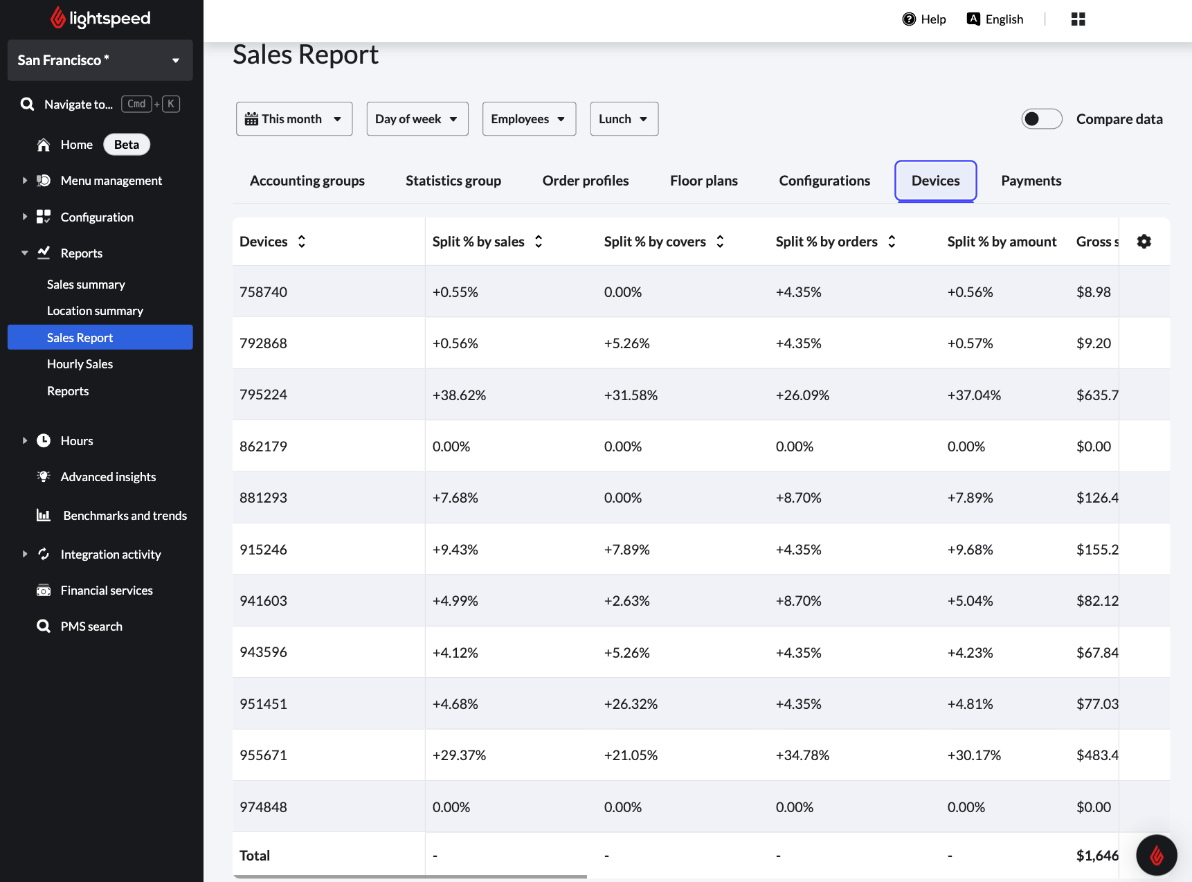 POS devices: POS devices are the iPads and iPhones that run the Lightspeed Restaurant app that employees use to take and manage orders. This tab lists all of your devices and displays data broken down into specific areas like Gross sales and split percentages.
