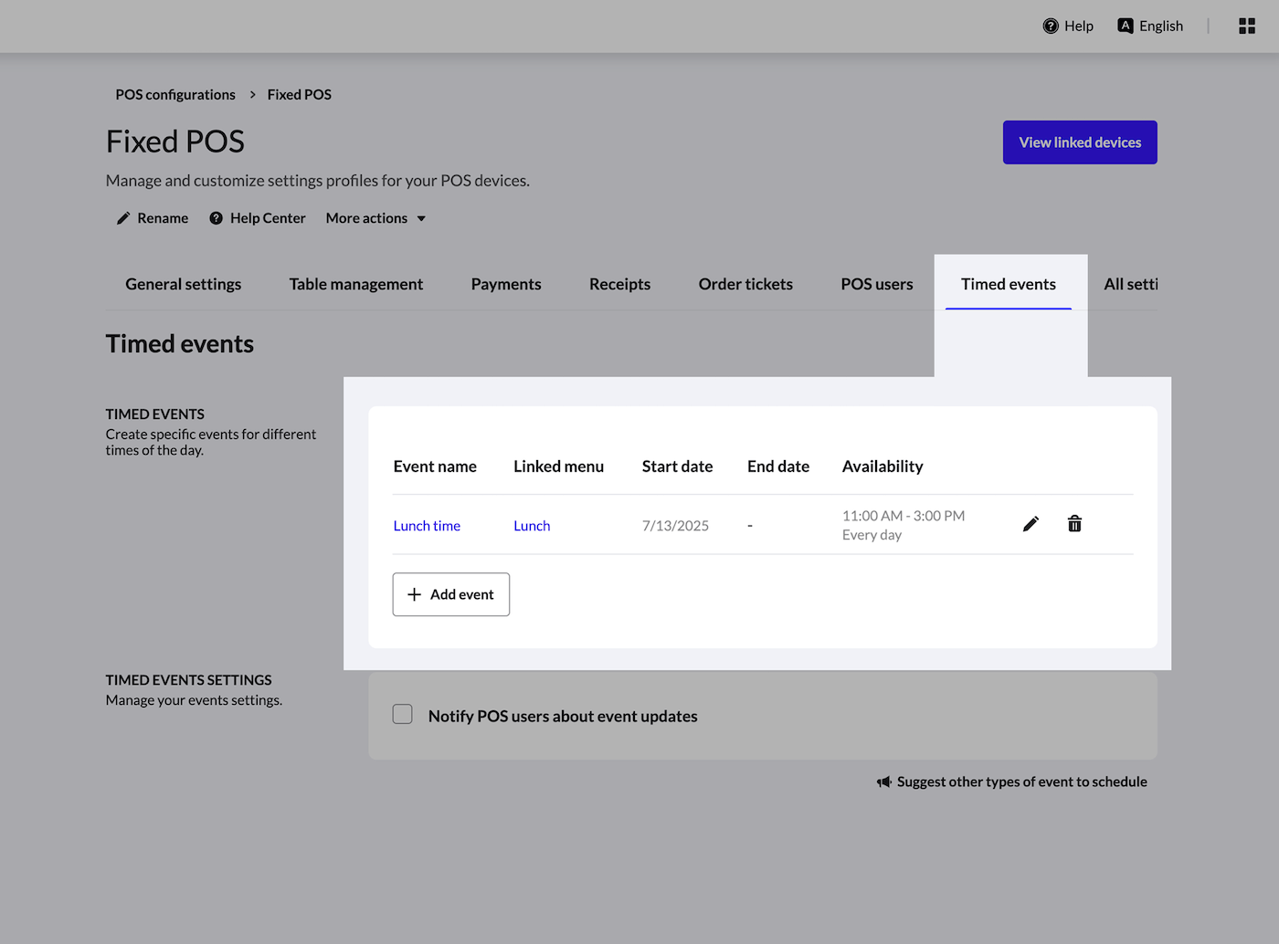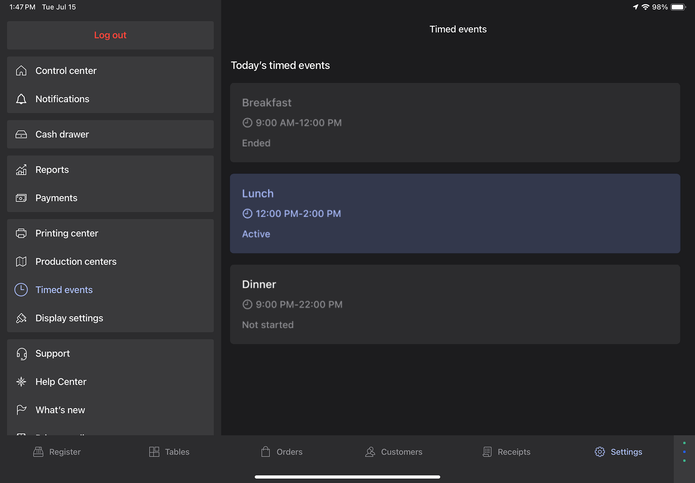 Employees can check which timed events will be happening on the current day from the Settings menu of the POS. This helps staff anticipate and prepare for changes throughout their shift.