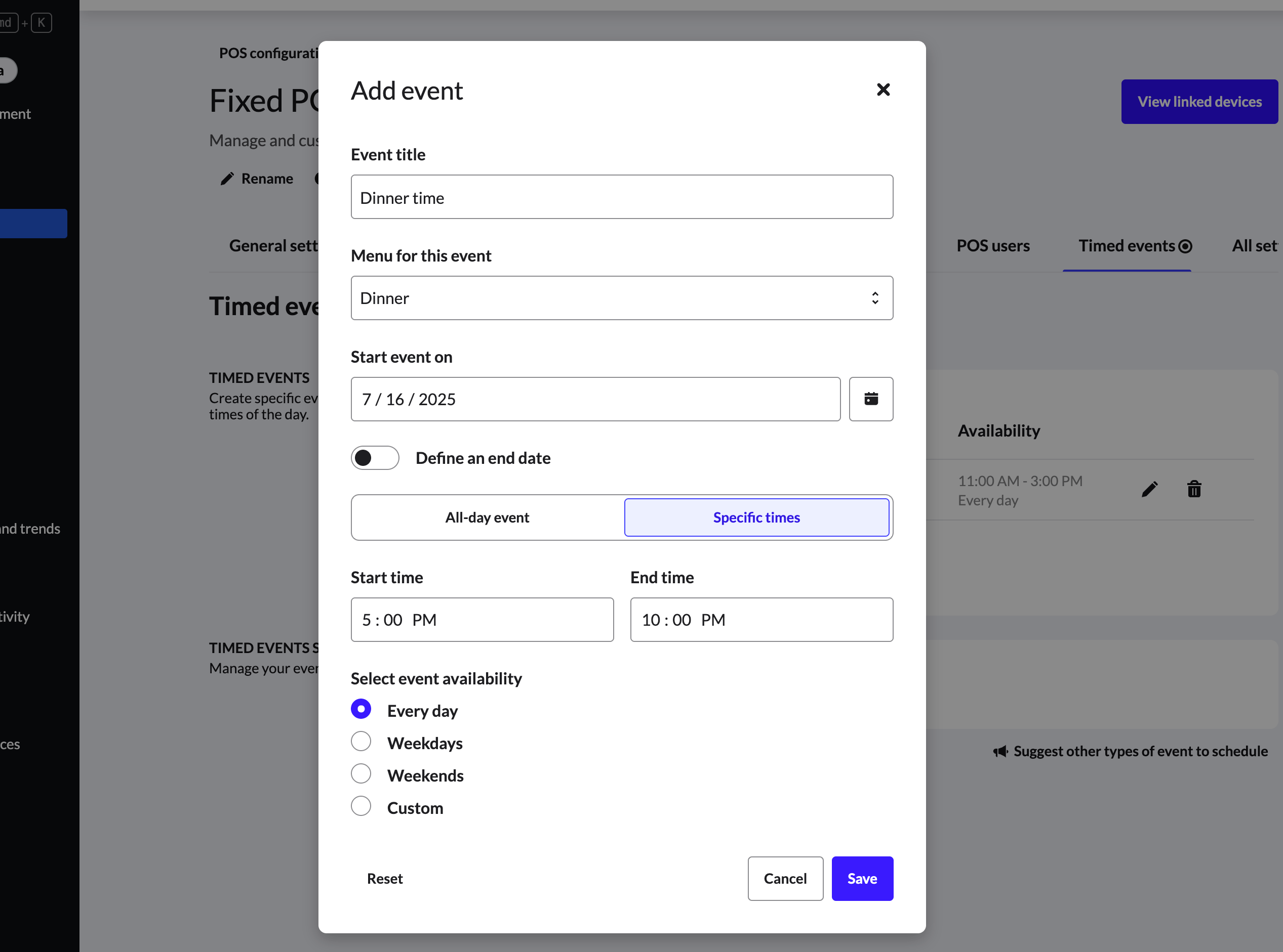 - The POS automatically reloads to implement the timed event's changes (for example, a new menu that take effects). If a staff member is working on an order, the POS waits to reload until they are done.