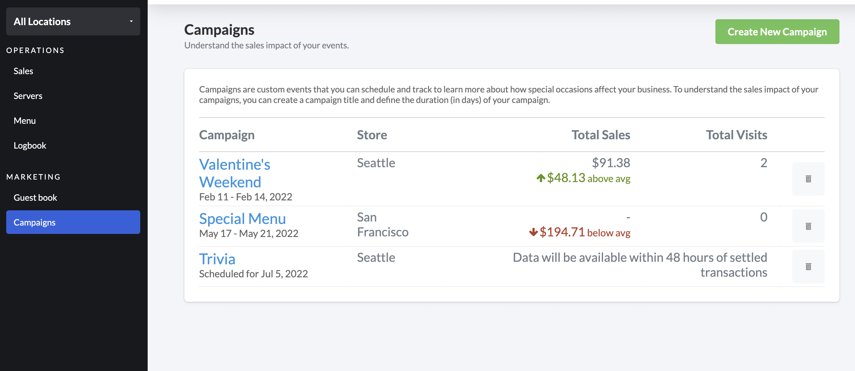 Scroll down the page to compare sales during your campaign to the average sales for the same day of the week from the prior year. You can also view a list of your campaign’s highest-spending customers and discover what percentage of your guests were new vs. repeat customers.