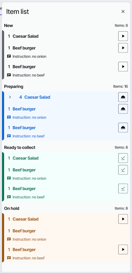 L’écran d’affichage cuisine (KDS) suit et affiche l’état de chaque commande. Il peut également afficher des résumés de l’état et du type de commande. À mesure que la commande est préparée et que l’article progresse dans la production, l’état doit être mis à jour manuellement pour conserver une vision précise du processus. Faire passer une commande à l’état suivant est parfois connu sous le nom anglais de « bumping ».