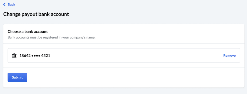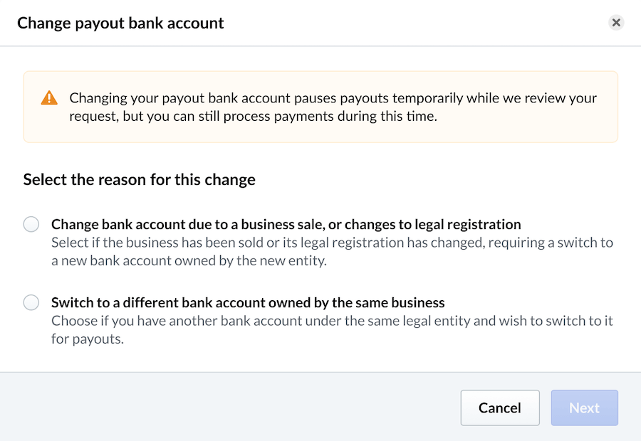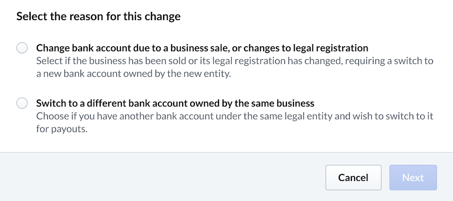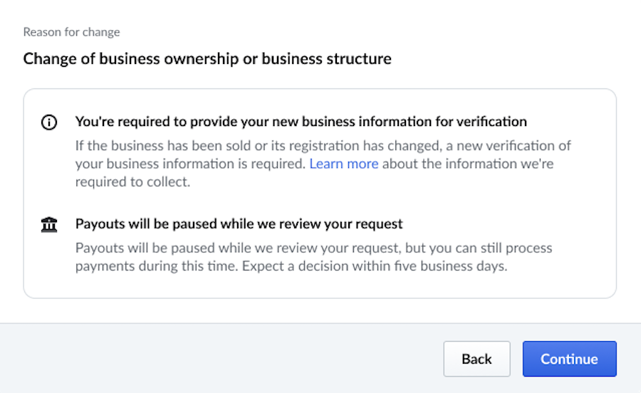 La modification de l’entité juridique liée à votre compte entraînera une suspension temporaire de vos dépôts quotidiens le temps que votre demande soit examinée. Les versements peuvent être retardés jusqu’à cinq jours ouvrables pendant le traitement de cette modification. Une fois la modification approuvée, les versements seront déposés sur le nouveau compte bancaire enregistré.