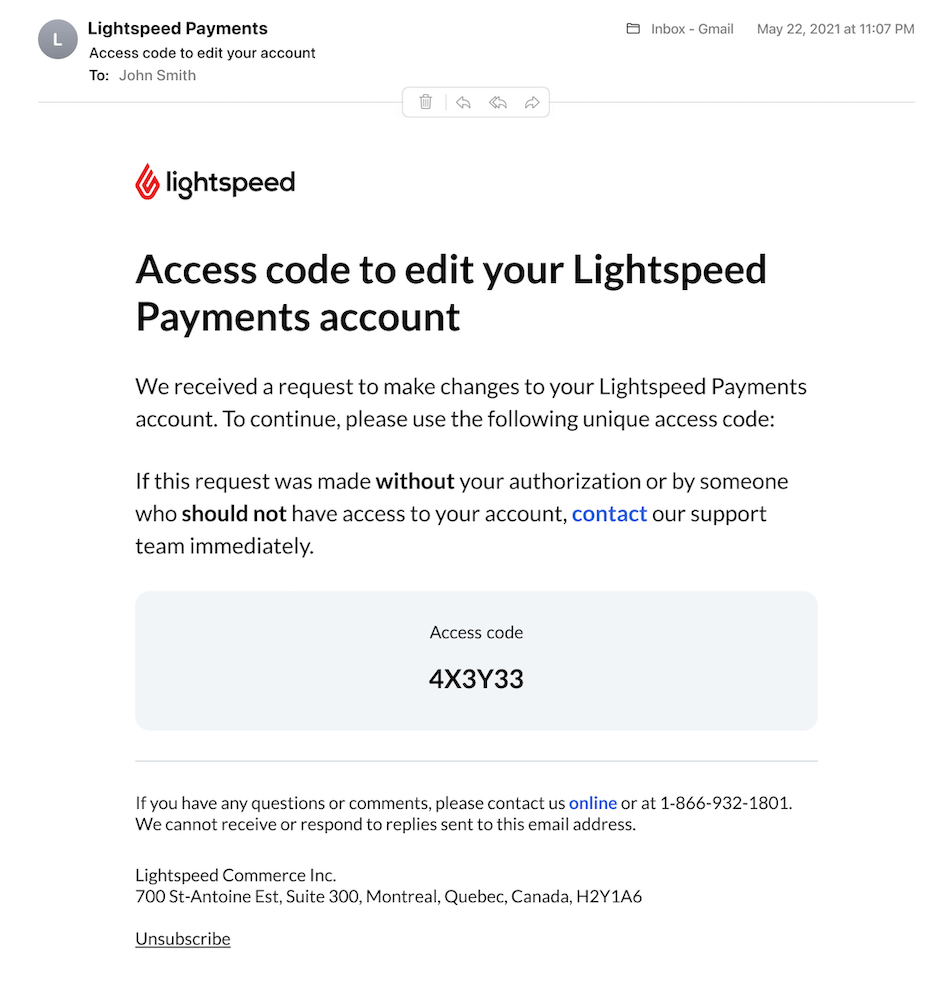Pour modifier vos coordonnées bancaires, vous devez avoir accès à l’adresse courriel utilisée lors de votre inscription à Paiements Lightspeed.