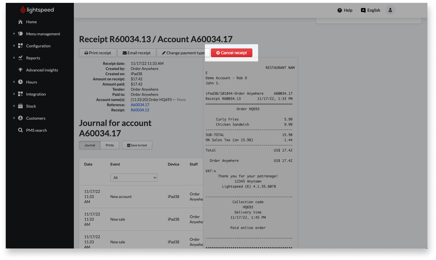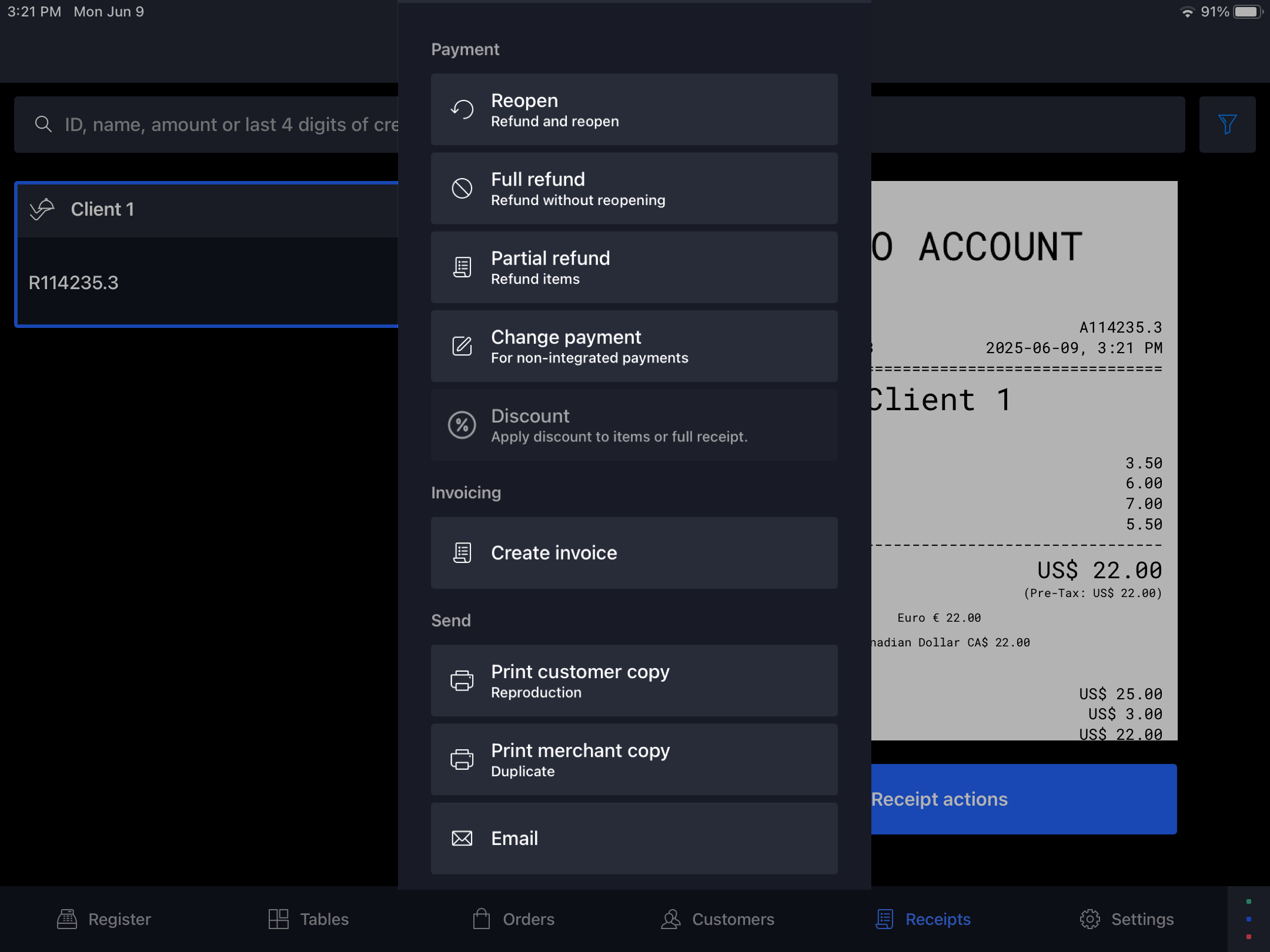 Le remboursement d’un reçu entraîne la création d’une transaction avec un montant négatif qui compense le total de la commande initiale dans le rapport. L’annulation d’un reçu est irréversible.