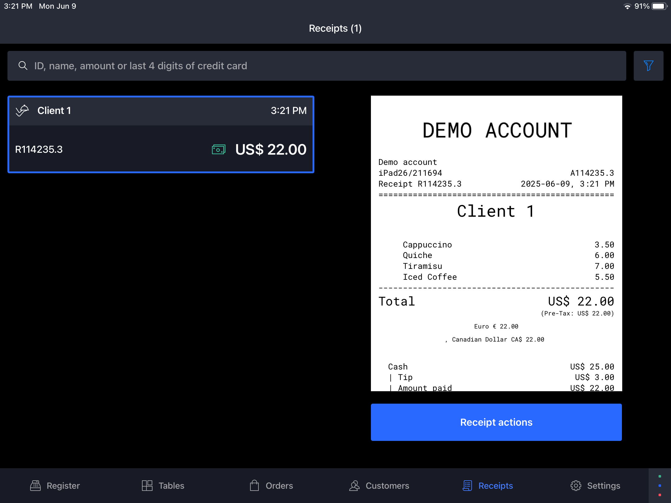 Dans l’application Lightspeed PDV restaurateurs, appuyez sur Reçus dans la barre de navigation.