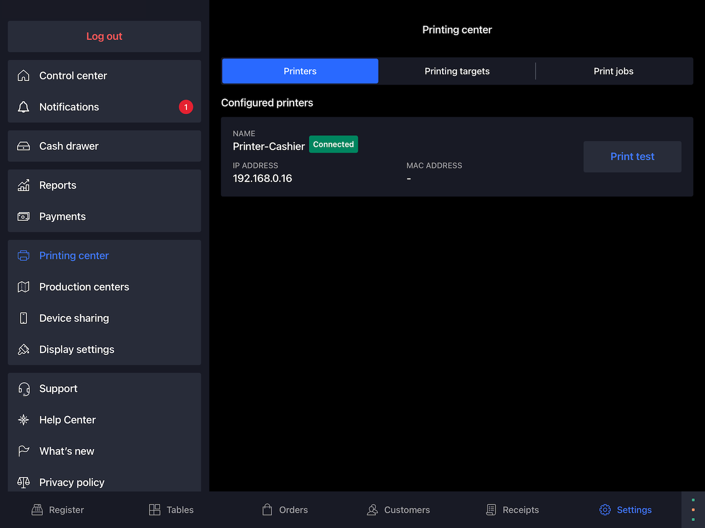 Un test d’impression réussi termine la configuration de base de l’imprimante. Cependant, pour imprimer des bons de commande, vous devez configurer les profils d’impression et les centres de production qui contrôlent le fonctionnement de votre imprimante dans votre restaurant.