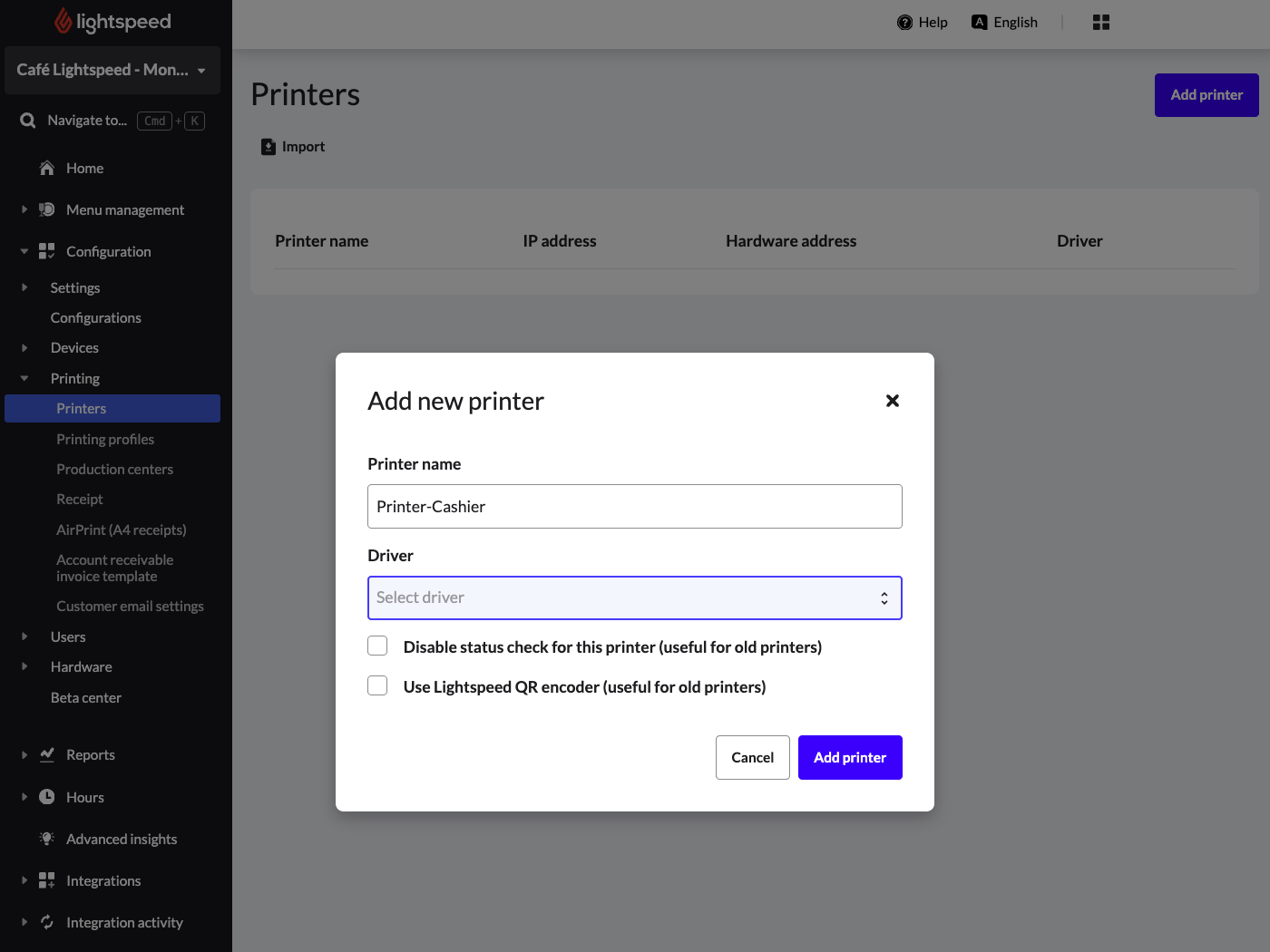 Après avoir effectué les étapes ci-dessus, connectez-vous à l’application Lightspeed Restaurant, rechargez votre configuration et imprimez un ticket école pour vous assurer que votre imprimante est connectée.