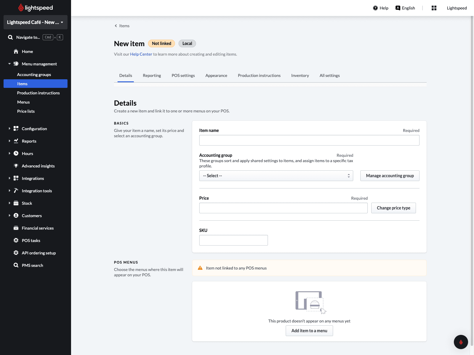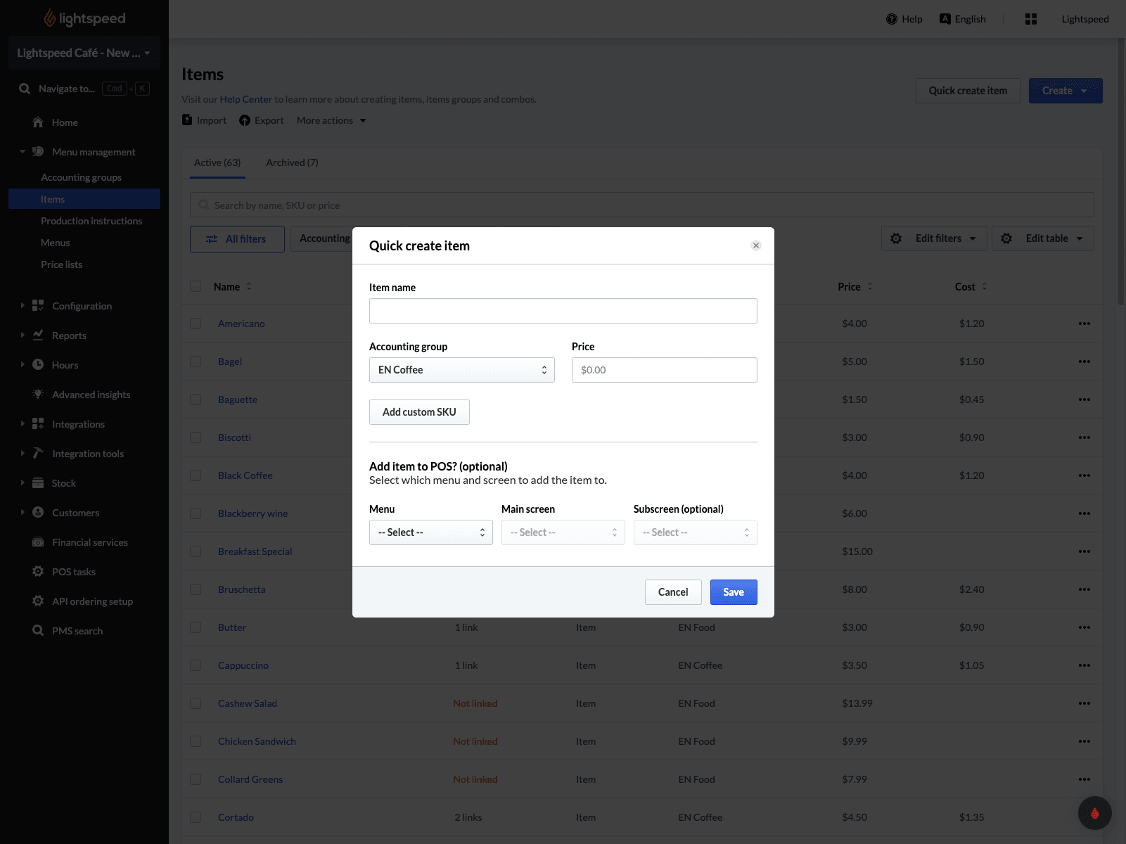5. (Facultatif) Ajoutez le menu à l’application Lightspeed Restaurant en le sélectionnant dans le menu déroulant Menu et en choisissant un écran principal et un sous-écran.