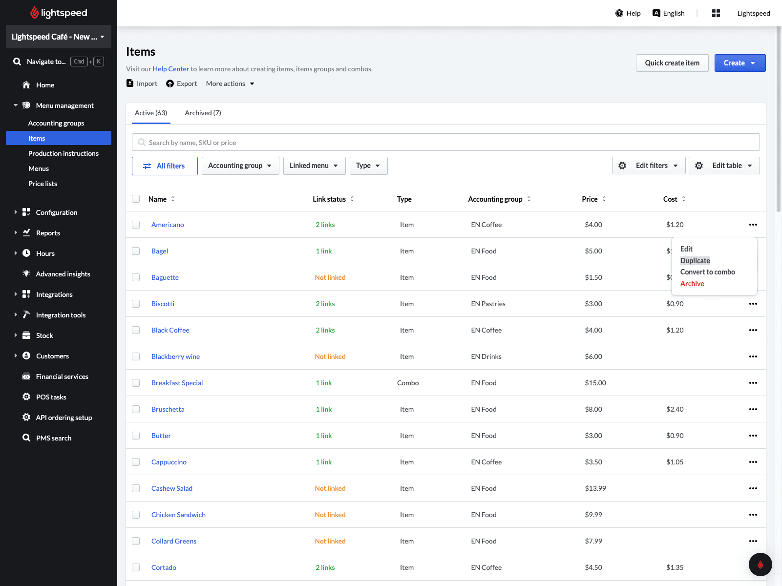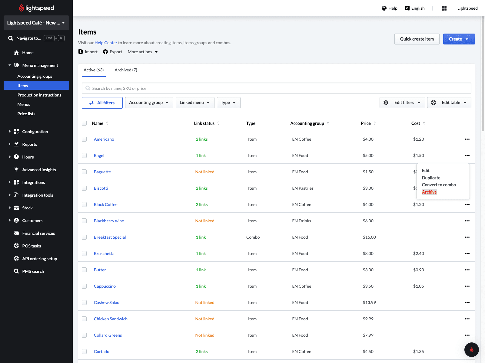Pour désactiver un article et le rendre indisponible à la vente sur Lightspeed Restaurant, vous devez l’archiver. Pour ce faire, suivez les étapes ci-dessous :