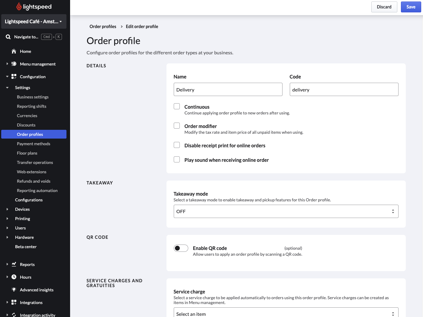 Les paramètres des profils de commande sont répartis en plusieurs sections : Détails, Commande à emporter, QR code, Frais de service et pourboires, et Récurrence. Lisez la suite de l’article pour obtenir une définition de chaque paramètre et connaître son incidence sur les commandes lors de l’utilisation de ce profil de commande.