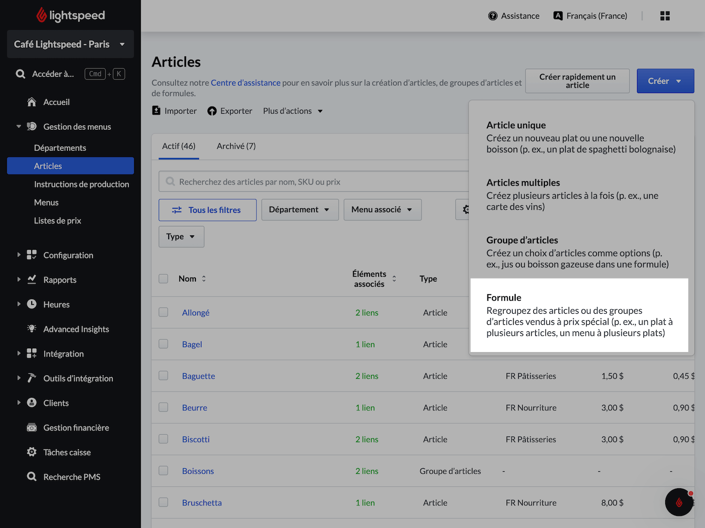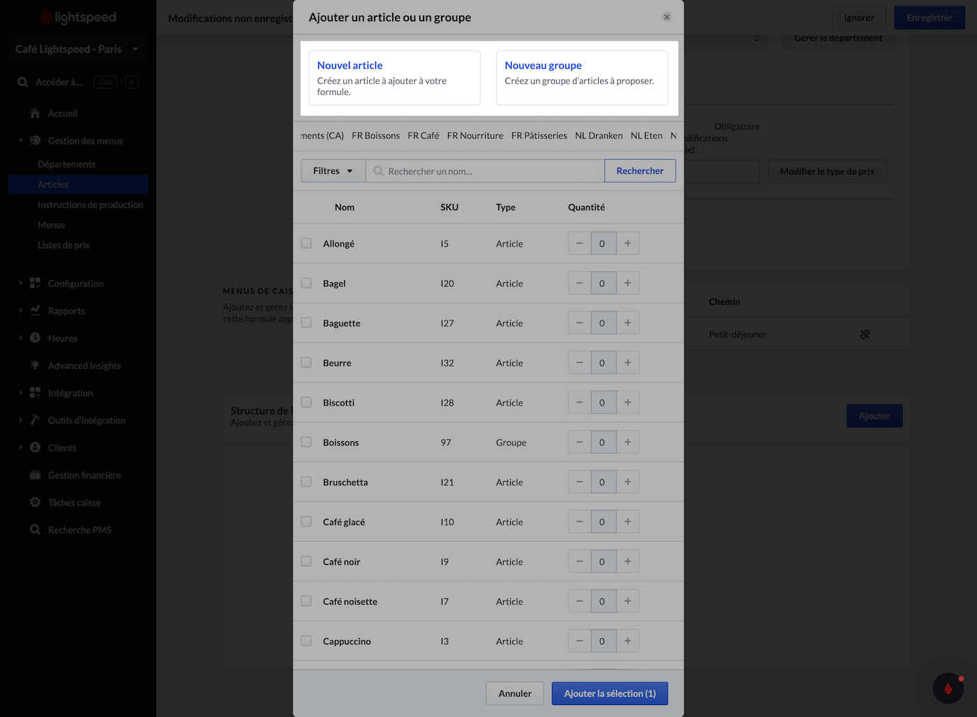 Vous pouvez ajouter des articles existants ou créer de nouveaux articles ou de nouvelles formules à partir de la fenêtre contextuelle. En cliquant sur Nouvel article, vous accédez au menu permettant de créer rapidement un article. En cliquant sur Nouveau groupe, vous ouvrez une nouvelle fenêtre contextuelle qui vous permet de créer un nouveau groupe.