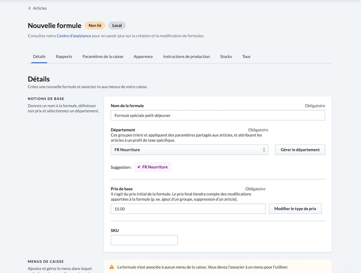 - Département : Il s’agit de la catégorie (généralement liée aux taxes) de la formule. Vous pouvez choisir parmi tous les départements créés à partir du back-office. Pour en savoir plus, consultez l’article À propos des départements.