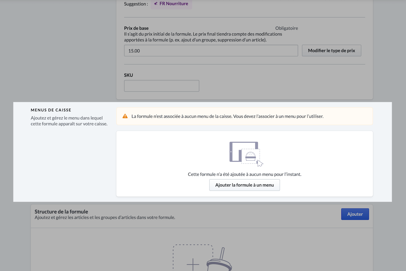 Vous pouvez à tout moment ajouter de nouveaux articles ou groupes à une formule. Dans la section Menus > Liste des articles, sélectionnez une formule en cliquant sur son nom. Dans l’onglet Détails, faites défiler la page jusqu’à la section Structure de la formule, puis cliquez sur Ajouter.