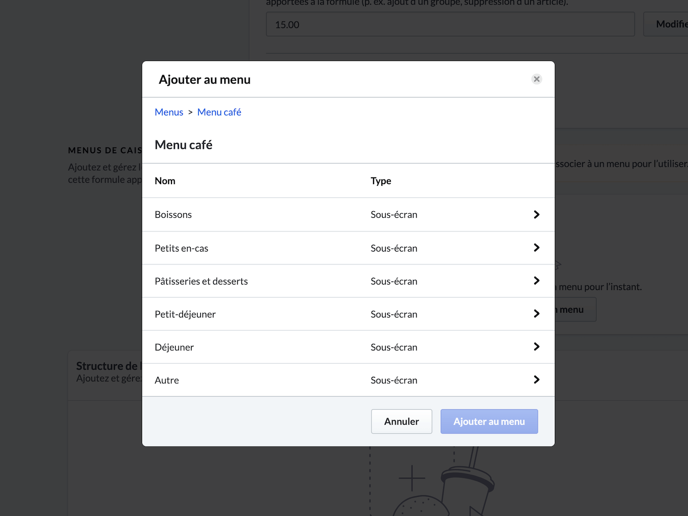 - Ajouter l’article à la caisse ? (facultatif) : Sélectionnez un menu, un écran principal et un sous-écran facultatif auxquels ajouter la formule.