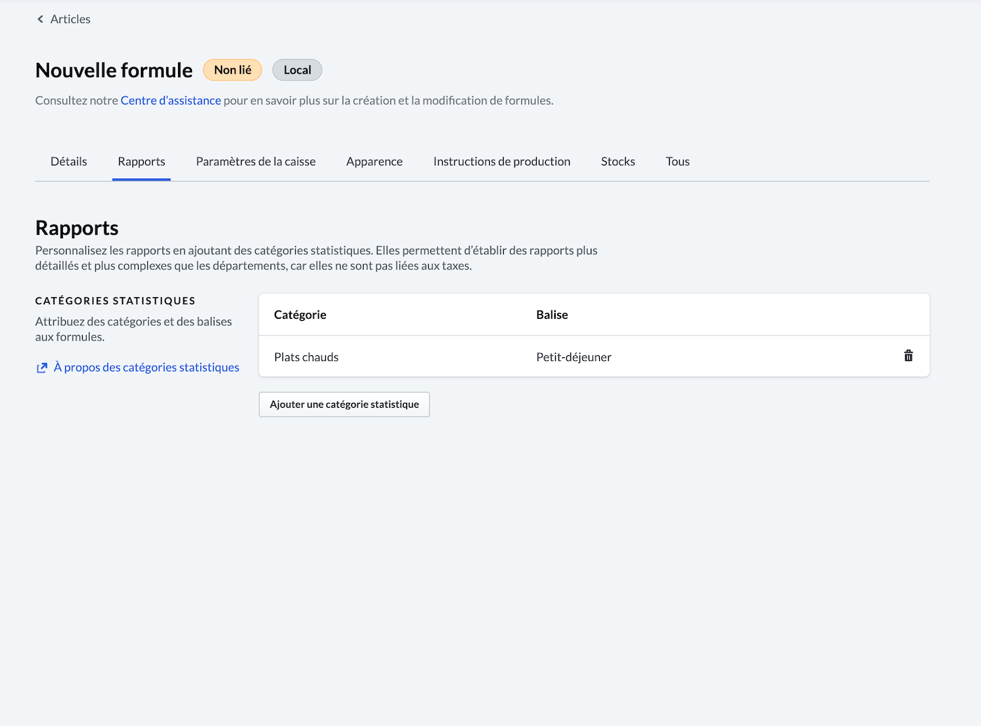 Personnalisez les rapports en ajoutant des catégories statistiques. Elles permettent d’établir des rapports plus détaillés et plus complexes que les départements, car elles ne sont pas liées aux taxes.