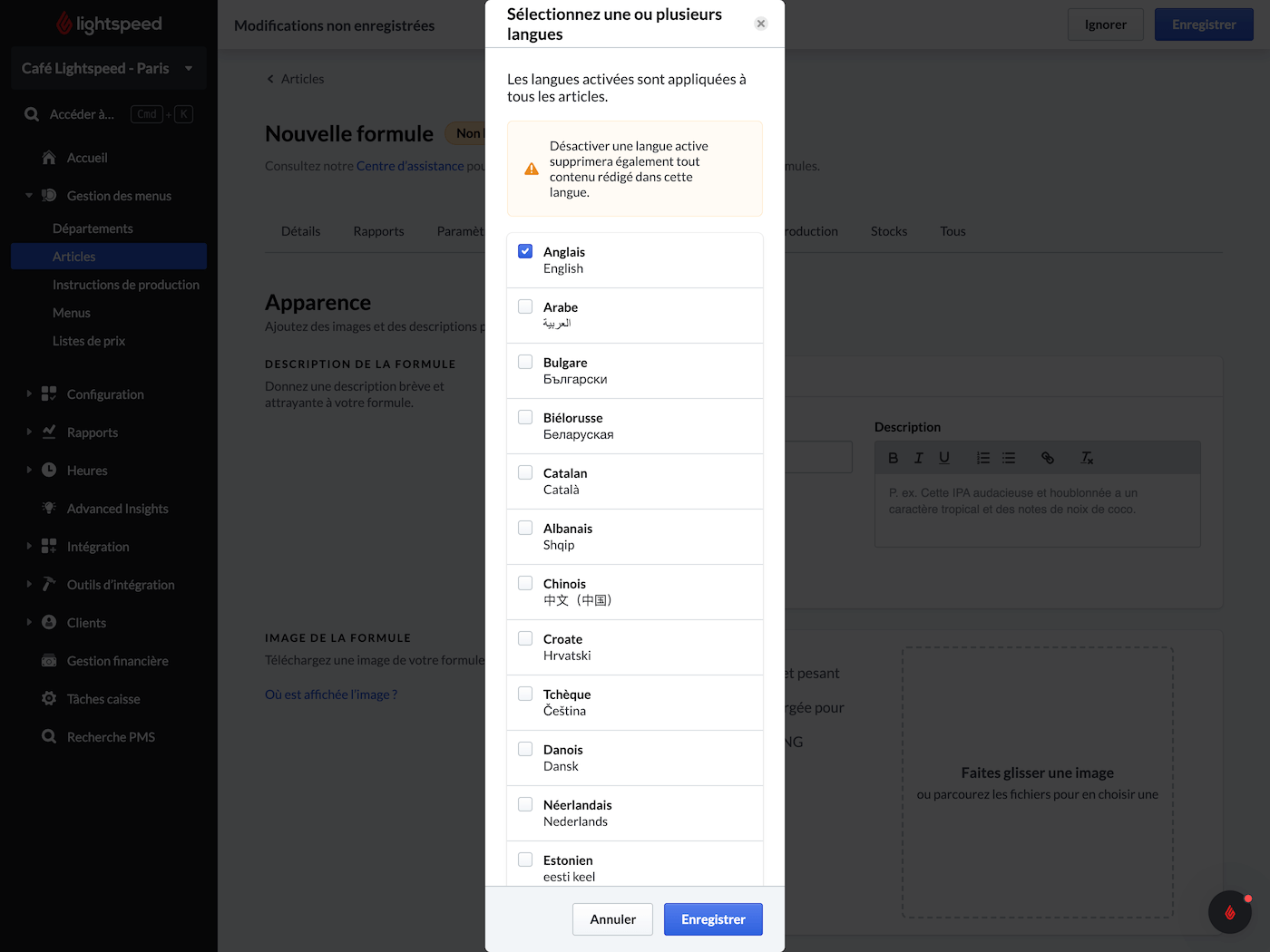 Il vous suffit de cocher les cases situées à côté des langues que vous souhaitez ajouter ou supprimer de la liste. Cliquez sur Enregistrer pour confirmer les modifications. La nouvelle liste des langues sélectionnées apparaîtra dans la barre de menus de la section.