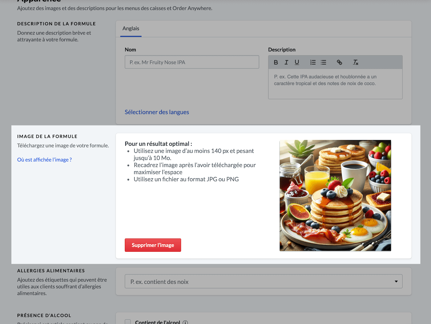 Ajoutez une description et des images à la nouvelle formule pour les menus présentés sur la caisse et sur Order Anywhere.
