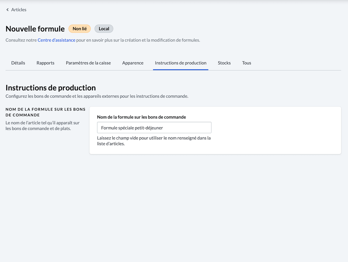 Cette section permet de gérer les instructions de production sur les bons de commande et les appareils externes. Saisissez un nom de formule qui apparaîtra sur les bons de commande, ou laissez le champ vide pour utiliser le nom renseigné dans la liste d’articles.
